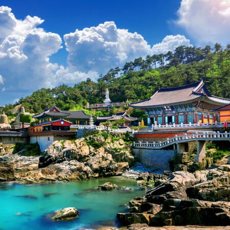 Begin your adventure with a visit to Jeonju, home to traditional Korean houses, rich heritage sites, and bustling markets. Marvel at the majestic Green Tea Fields in Boseong, explore the serene Songrim Park in Hadong, and cruise along the picturesque Haegeum River in Geoje. As you make your way to the coastal cities, take in the stunning views from the Yeosu Maritime Cable Car and wander through the enchanting Odongdo Island, known for its vibrant camellia trees.